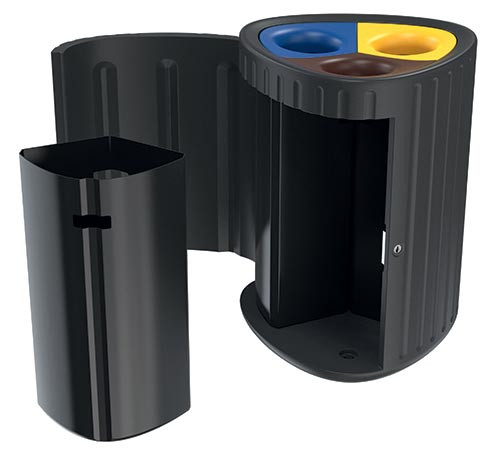 Corbeille tri sélectif en plastique recyclable pour l’aménagement et la collecte des déchets dans les espaces publics et voiries.