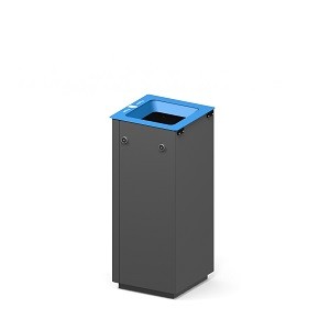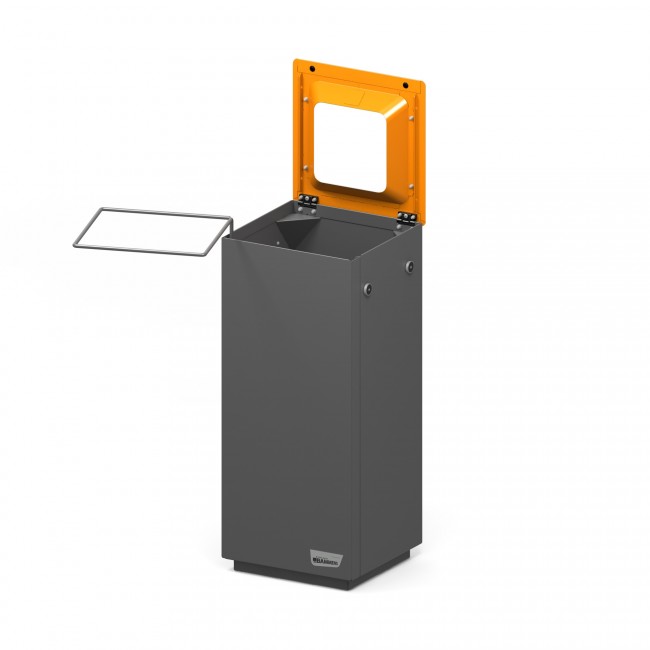 La corbeille et son couvercle, également en acier galvanisé, bénéficient d’un revêtement en poudre polyester pour une finition élégante et durable (RAL 7016 pour le corps et finition brillante pour le couvercle).
