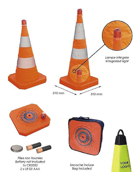 feu clignotant, ces outils servent au balisage de jour avec leurs 2 bandes fluo orange et au balisage de nuit avec leurs bandes réfléchissantes haute visibilité.