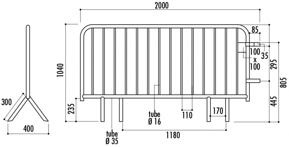 - Cadre en tube Diamètre : 35 mm, barreaux Diamètre : 16 mm soudés au cadre.
