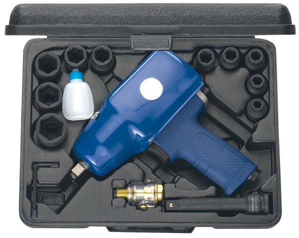 Remarque : La clé à chocs composite est livrée en coffret avec les accessoires supplémentaires ci-dessous : - 10 douilles G 1/2 à chocs courtes (9,10,11,13,14,17,19,22,24,27) - 1 rallonge longueur 175 mm - 1 mini huileur - 1 burette d'huile