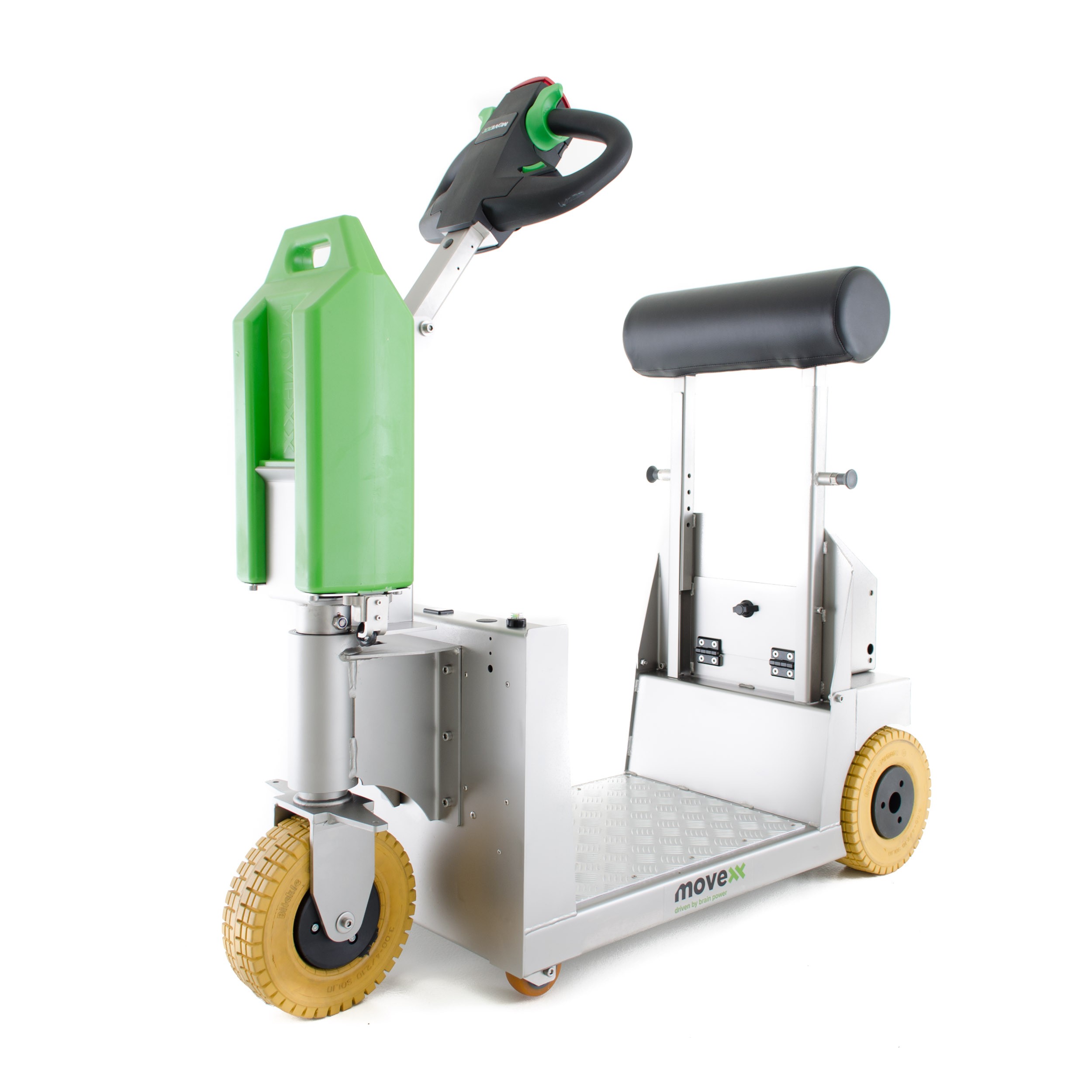 - Ergonomique, il se pilote à l’aide d’un timon articulé en étant en position assis / debout.