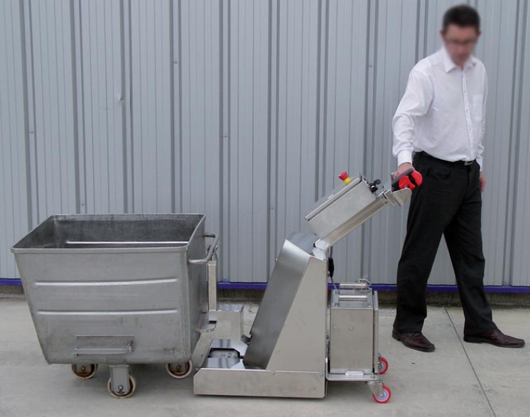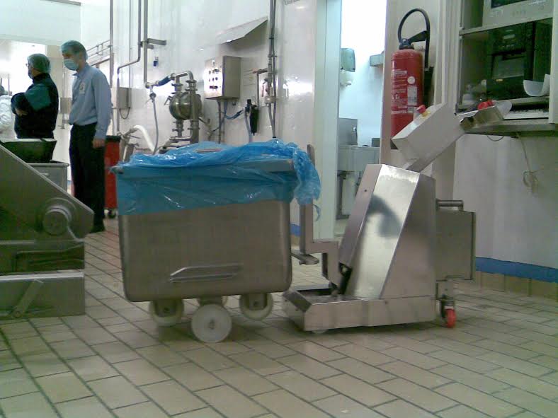 31/07/2019besoin d"un tracteur pousseur inox milieu agroalimentaire, pour déplacer un bac de 600 Kg sur carrelage et légère pente de sol. roues non marquantes, déplacement sur sol humide et carrelé avec légères pentes de sol