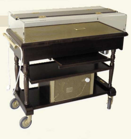 Ce chariot à desserte est équipé d’une coupole plexiglas transparent, pour mettre en avant les préparations.