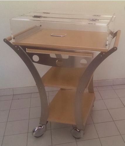 Il est composé d'une structure en inox brossé avec 3 plateaux en bois teintés vernis et une coupole plexi ouverture des 2 cotés.