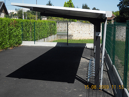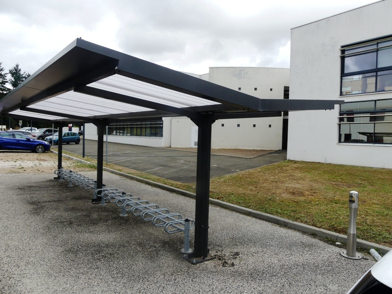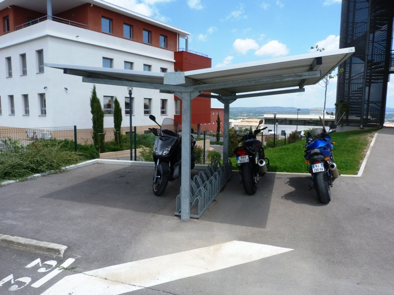 Sa toiture bac acier ou translucide en méthacrylate protège efficacement les vélos et motos contre les intempéries.