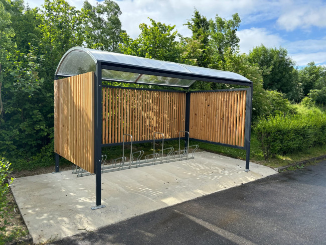Fermeture de l'abri sur 3 côtés par vitrages trempés de sécurité incolore épaisseur 4mm (ou 6mm sur les modèles M100, M90) et fixés par pinces à vitrage Variante d'habillage latéral en liteaux de bois en remplacement des vitrages sécurit.