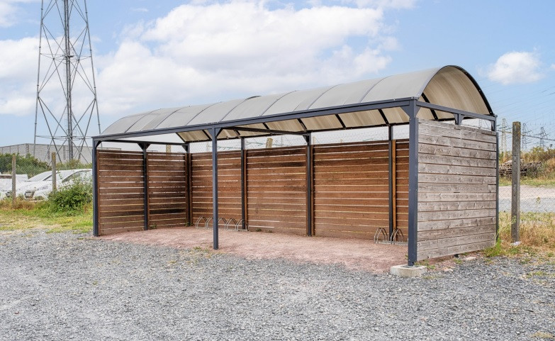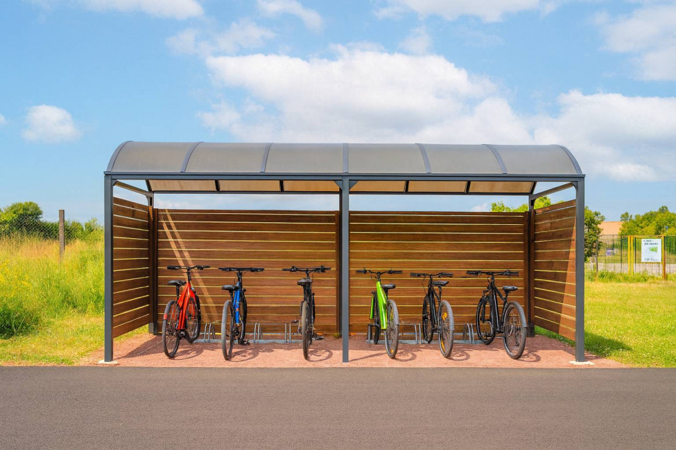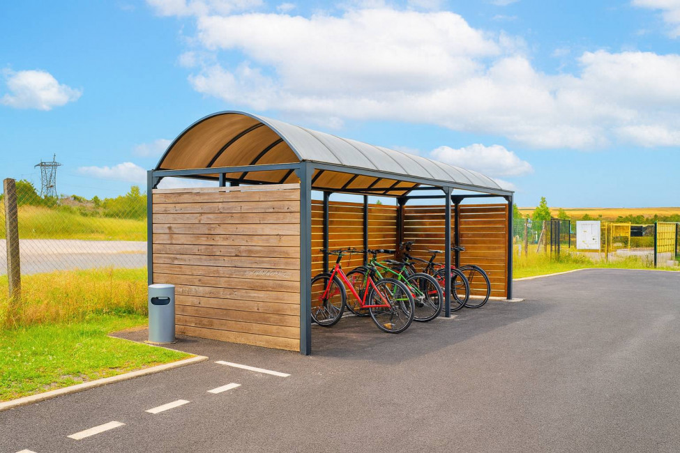 La toiture en dôme en polycarbonate translucide protège efficacement les vélos tout en laissant passer la lumière.