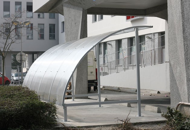 Cet abri vélo moto extérieur toiture en polycarbonate est un élégant équipement parking 2 roues à la toiture en forme de quart de cercle.
