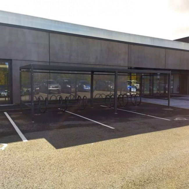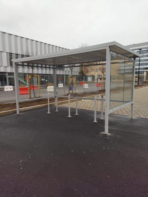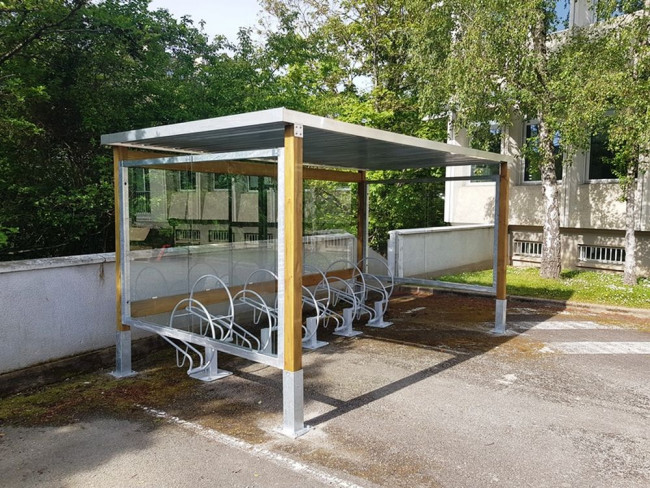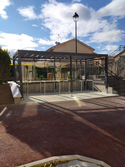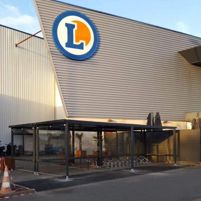 Fermeture de l'abri sur 3 côtés par vitrages trempés de sécurité incolore épaisseur 4mm (ou 6mm sur les modèles M100, M90) et fixés par pinces à vitrage Variante d'habillage latéral en liteaux de bois en remplacement des vitrages sécurit.