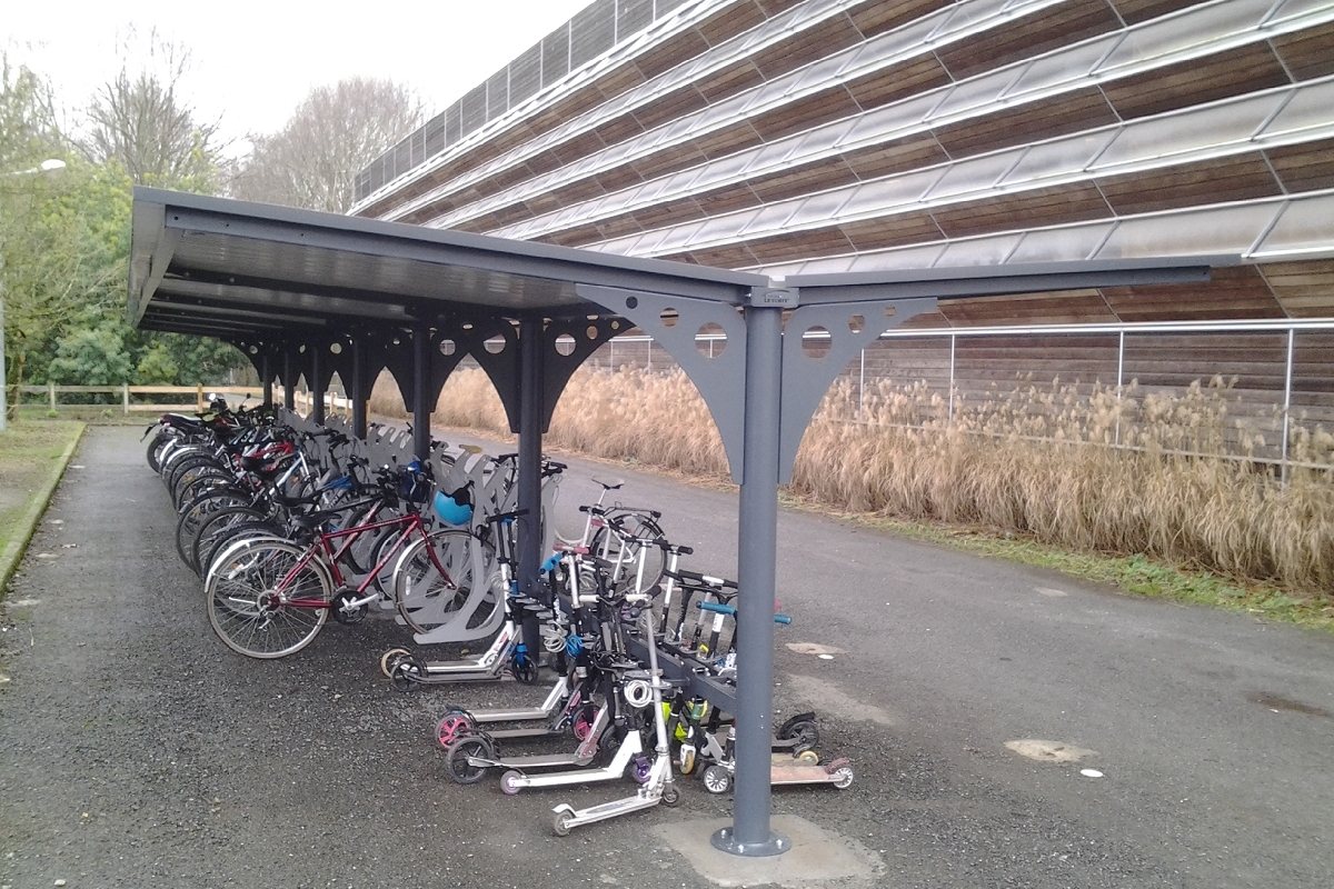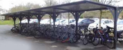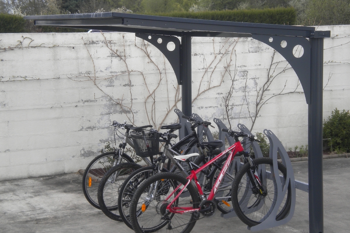 Ce parking à vélos collectif est muni d’un toit plat avec pente arrière 5% pour protéger les cycles de la pluie.
