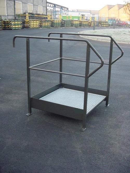 La plateforme est composée d’une plate forme équipée d’un caillebotis galvanisé à chaud et antidérapant et d'une patte de fixation au sol.