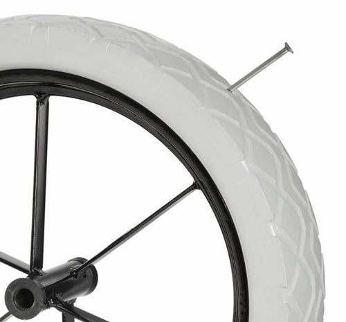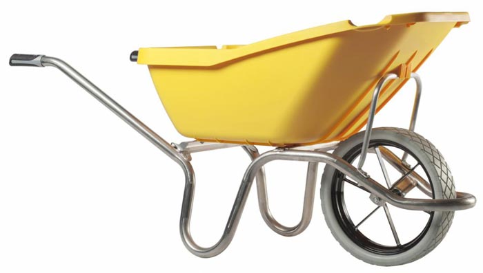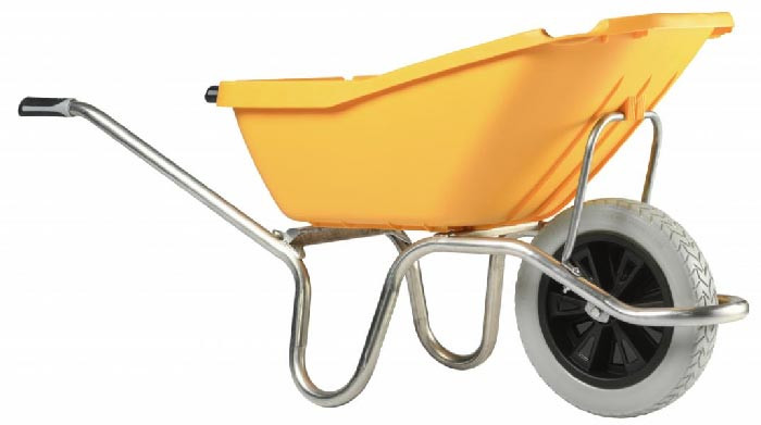 Cette brouette possède une caisse polypro jaune 110 L, souple, solide, résistante aux chocs et aux intempéries.