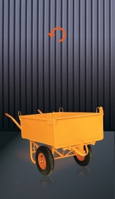 Cette brouette japonaise à basculement frontal est dotée d'un système de fermeture breveté, ouvrable par le bas à la main ou par le pied.