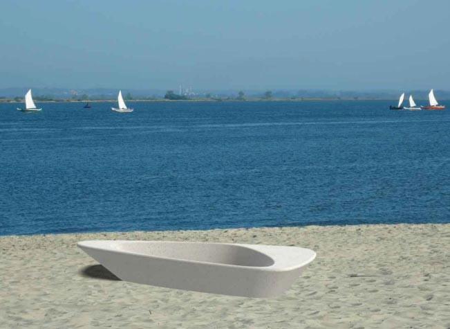 Ce banc est inspiré d'un bateau en béton ancré au continent, confère au banc un style iconique aux formes organiques.