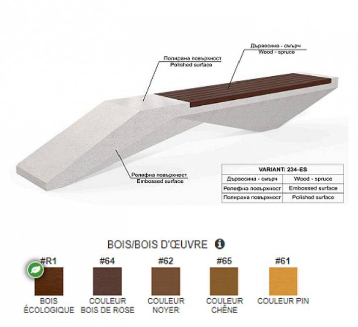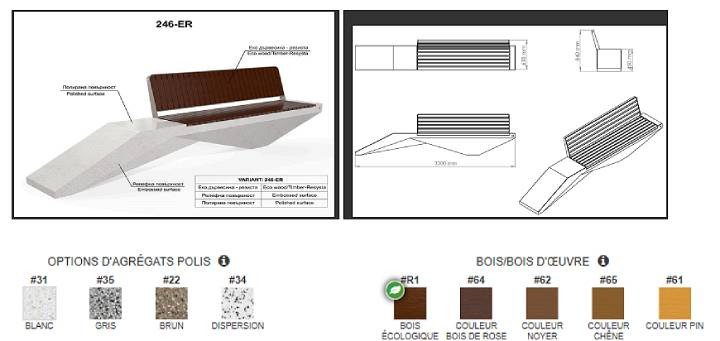 L’assise peut être en bois FSC ou en bois écologique ReSysta®. Cette configuration améliore le confort dans les zones où les usagers s’assoient régulièrement.