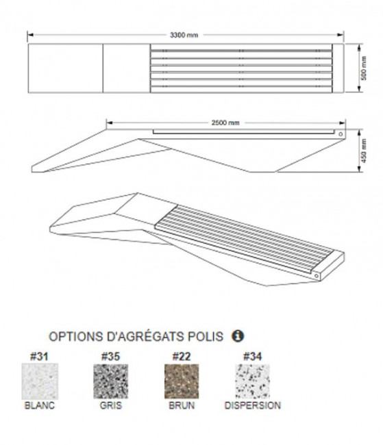 Les surfaces polies et vernies améliorent l’hydrophobie du béton, limitent l’encrassement et facilitent l’entretien. Avec ses 330 cm de longueur, ce mobilier s’intègre facilement dans vos projets urbains.