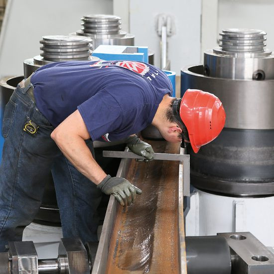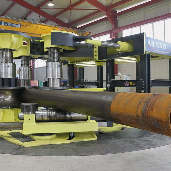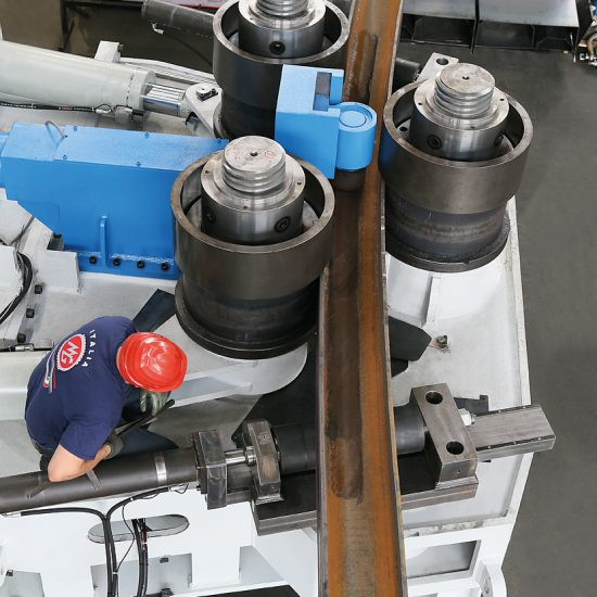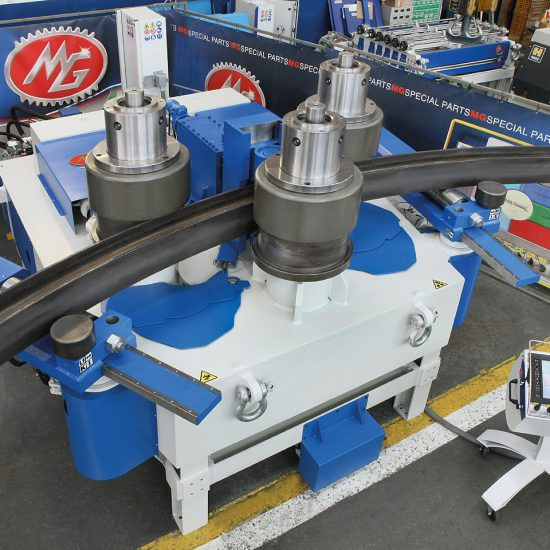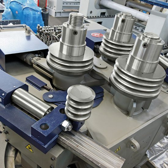 - Les rouleaux de flexion latérale se déplacent sur un axe rectiligne réduisant l’espace entre eux