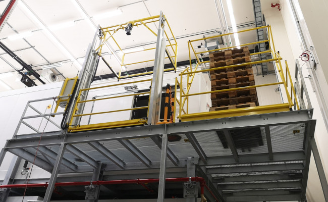 L'ouverture de la barrière côté bord de vide permet la dépose des charges à l'étage tout en garantissant la sécurité de l'opérateur à l'étage qui se trouve derrière le garde-corps fermé. Une fois la charge déposée sur la mezzanine, l'opérateur fait basculer la barrière et ferme ainsi le côté bord de vide. Par le même mouvement, la barrière s'ouvre du côté de la mezzanine et donne ainsi accès à l'opérateur à la charge, qu'il peut retirer sans aucun risque de chute.