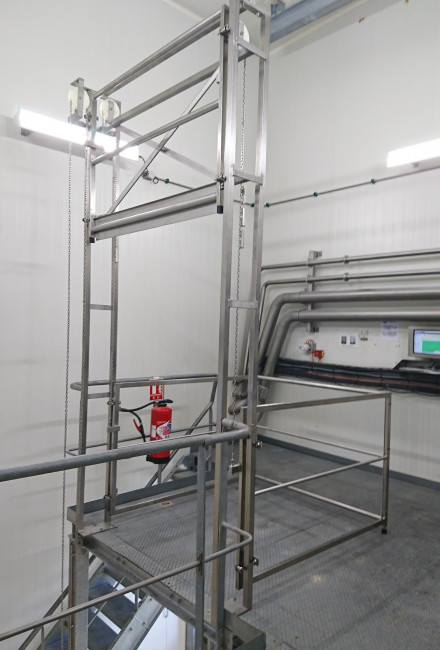 Il s'agit d'une barrière écluse de type coulissant vertical qui permet de dégager la zone de dépose quand le garde-corps arrière est relevé. Quand celui-ci est baissé, il crée une cage de sécurité sur la plate-forme dans laquelle la charge peut être déposée en tout sécurité. Le mouvement du garde-corps avant fonctionne à l'inverse : quand le garde-corps arrière est relevé, celui de devant est fermé. Quand le garde-corps arrière est baissé, celui de devant est relevé.