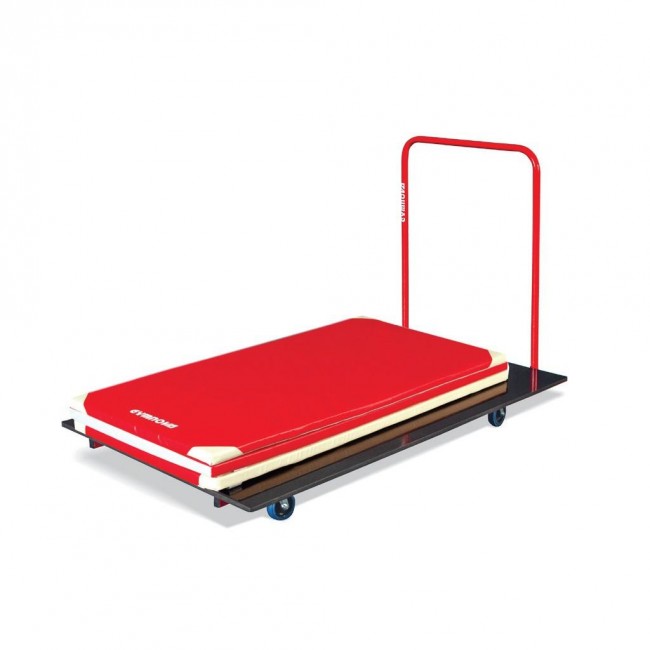 Ce chariot de transport conçu pour ranger horizontalement tapis et matelas, équipé de roues omnidirectionnelles de grand diamètre.