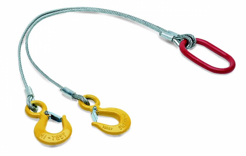Ce matériel de levage est équipé de 2 brins cossés manchonnés avec anneau central et crochets de sécurité.