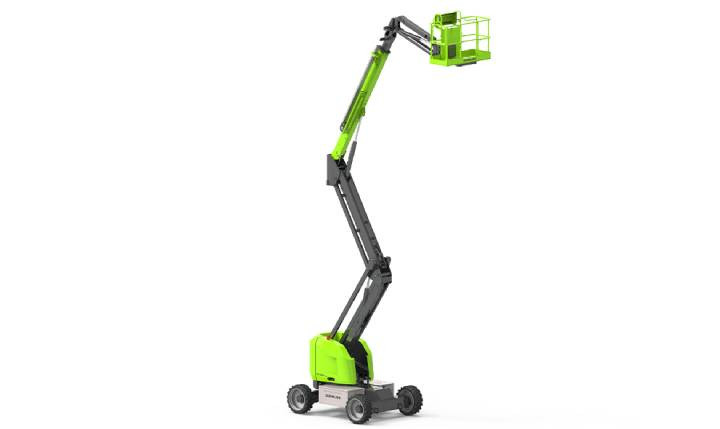 Vous atteignez 17,8 m de hauteur de travail (plateforme à 15,8 m) avec une portée horizontale de 9,72 m et une hauteur d’articulation de 8 m. Pour manœuvrer au plus près, la tourelle tourne à 360° (non continu) et la plateforme pivote à ±90°. Vous travaillez à deux avec vos outils grâce à une charge utile de 250 kg.
