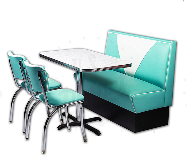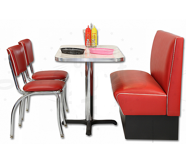 Nous vous proposons notre composition de tables, chaises et banquettes vintagetypiques des diners américains, fabriqué aux états unis dans le respect de la tradition du siècle dernier.