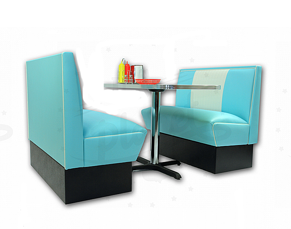 - salle 1 : 4 banquettes de 120cm style diner années 50-60 de couleur bleue turquoise + 2 tables style alu brossée ou noire de 120*60 (ou 50 selon modèle)
