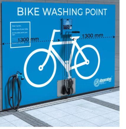 Point de lavage de vélos adapté pour une utilisation dans les espaces publics, à la fois pour des applications intérieures et extérieures.