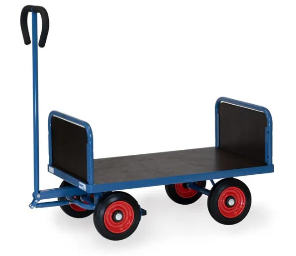- Plateau en contreplaqué hydrofuge, avec 2 ridelles petits côtés hauteur 300 mm, châssis en tube d'acier.