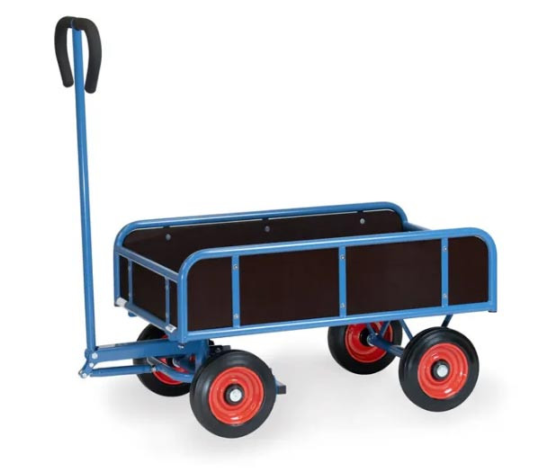 Il est doté d'une plateforme en contreplaqué hydrofuge antidérapant et possède un essieu directeur à timon et poignée de sécurité.