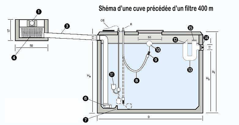 Ensuite, L’eau filtrée entre dans la cuve ou un système anti remous évitera les perturbations dans la cuve. La cuve est aussi équipée d’un système d’évacuation des flottants ainsi que d’un siphon coupe odeur.