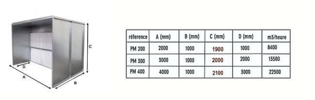 Le mur filtrant sec avec prolongement en tôle permet d'aspirer et épurer les particules relatives aux actions de peinture et vernissage, conformément à la législation en vigueur en matière de santé et de sécurité.