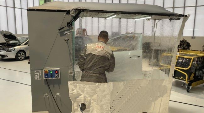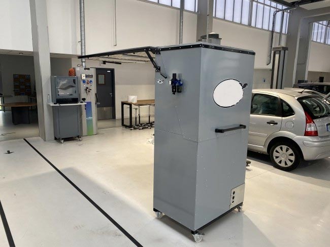 La cabine est une cabine qui peut être ajoutée à la cabine de peinture principale, car elle est conçue pour les opérations rapide (pare-chocs, portes démontées, etc...).