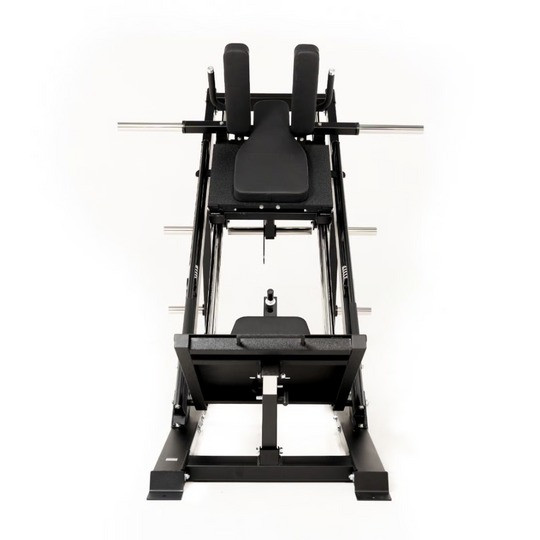 C'est une combinaison du leg press et du hack squat : le leg press sollicite principalement les quadriceps, les fessiers et les ischio-jambiers, tandis que le hack squat cible davantage les quadriceps et les mollets.
