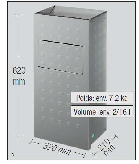 - Équipé d‘une trappe, seau pour les cendres (volume env. 2-L) et seau intérieur (volume env. 16-L), enlevable individuellement.