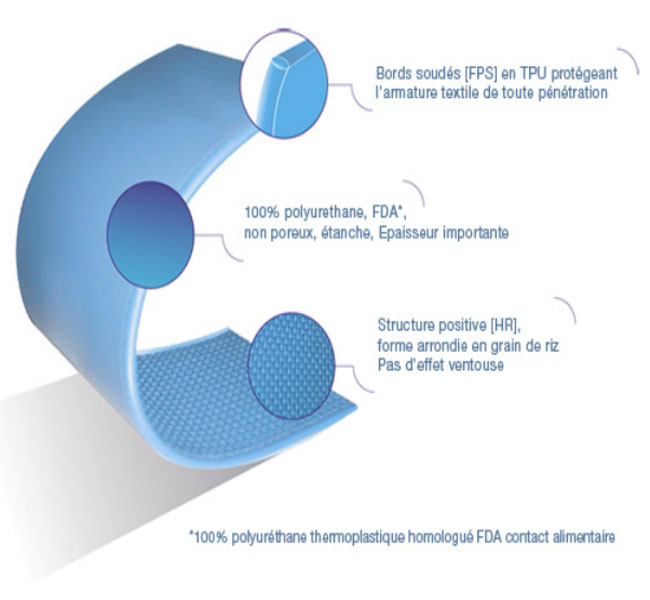 La carcasse textile étant complètement recouverte de TPU, la bande transporteuse devient totalement étanche. Elle est ainsi hermétique aux agressions bactériologiques et micro-organiques.
