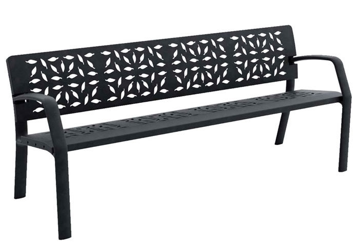 Ce banc public est monté sur 4 pieds perforés pour une fixation au sol par vis d’ancrage (non fournis).