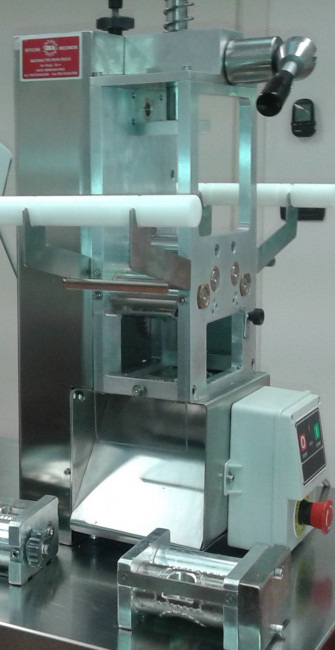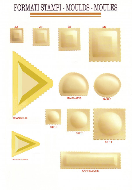 Machine pour la fabrication de raviolis en bande, de plusieurs types (carrés, ronds, demi-lune, triangulaires) avec des farces souples à base de viande, légumes, fromages.