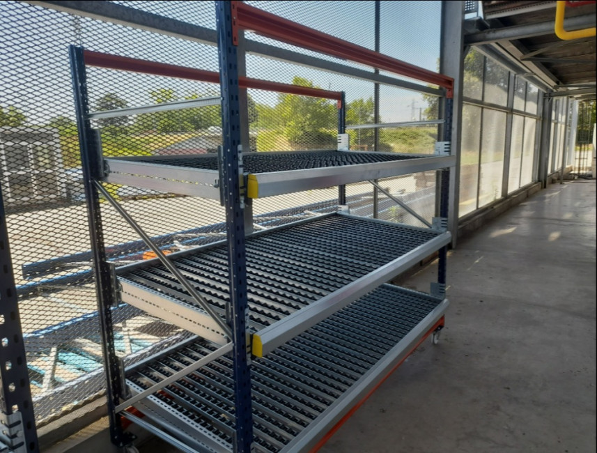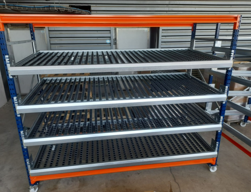 Le rayonnage dynamique mi-lourd est conçu avec une structure de mini rack et des rails à galets personnalisés en fonction de la charge stockée.