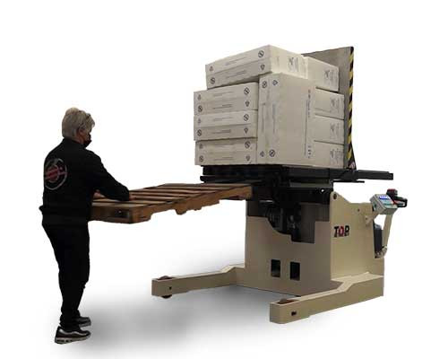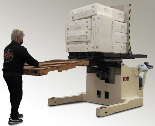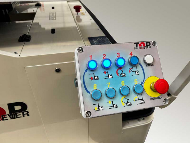 Le retourneur de palette mobile « Retriever » dispose d'un panneau de contrôle latéral qui contrôle toutes les phases du changement de palette. En quelques secondes, il est possible de remplacer la palette et en même temps d'accéder facilement à la palette et à la partie inférieure de la charge. De cette manière, il est possible de remplacer les produits endommagés également placés à la base de la charge sans gaspillage de ressources et avec des niveaux de sécurité plus élevés.
