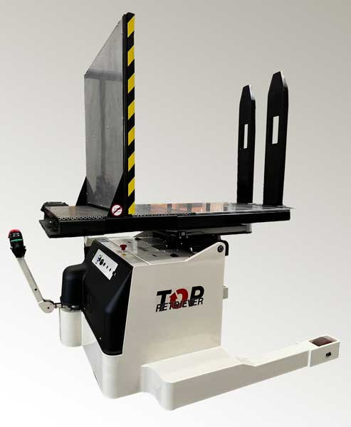 Retriever est un inverseur de palettes mobile électrique actionné par des commandes de timon et alimenté par une batterie au gel. Grâce à sa polyvalence, il permet un changeur de palettes rapide dans des espaces très confinés sans dédier une zone spécifique de votre usine à cette opération.