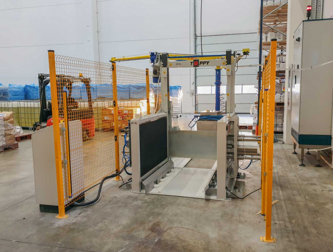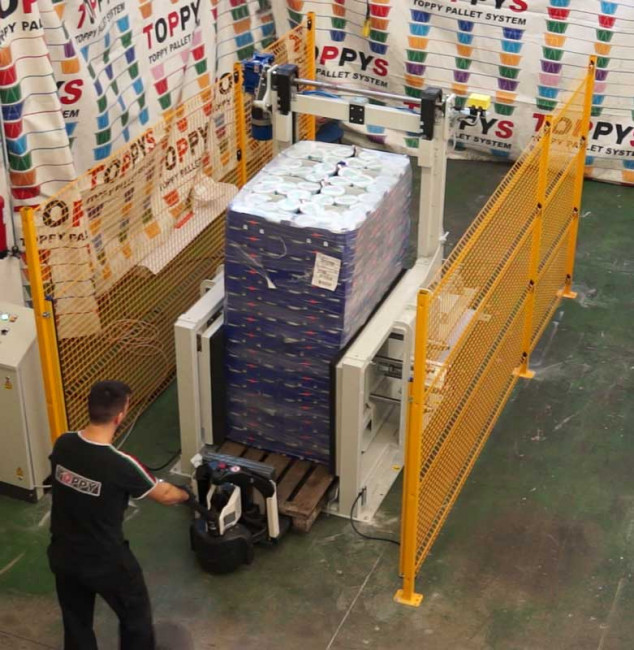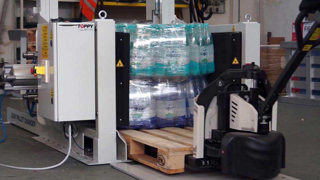 Si vous recherchez un changeur de palettes stationnaire qui ne renverse pas le produit, le transfereur de palette « Easy Changer » est l’une des solutions les plus polyvalentes de la gamme Toppy. Il effectue l’opération de changement de palette en moins de 60 secondes et empile automatiquement les palettes changées dans le cadreur de palettes intégré à la machine.