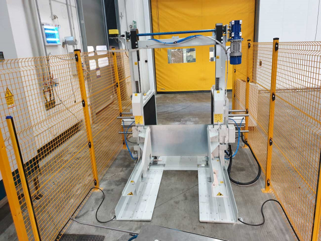 Le transfereur de palette « Easy Changer » est une station de changement palette innovante et compacte, intégrant un nouveau type d’empileur de palette. Le transfereur de palette « Easy Changer » effectue un double travail : il permet de remplacer la palette sans faire basculer la charge et de stocker la palette remplacée derrière la machine elle-même dans un distributeur de palettes spécial. Ce transfereur depalettes est entièrement automatique et équipé en standard de barrières de sécurité et de barrières immatérielles de sécurité.