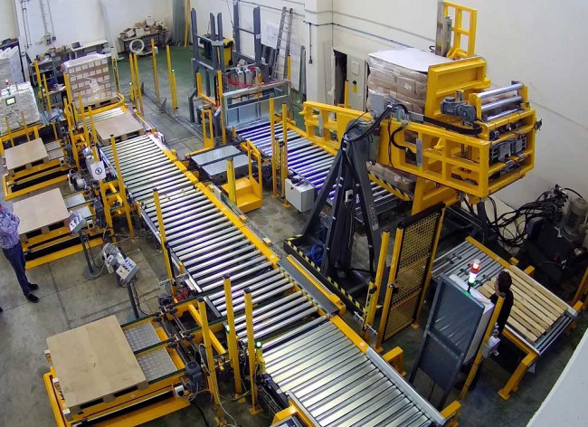 Ce système entièrement automatique est équipé d’un système de centrage afin de permettre au système de manutention de charge de centrer la charge d’une palette en bois (800×1200 mm) au centre de la palette plastique de réception (1000×1200 mm).