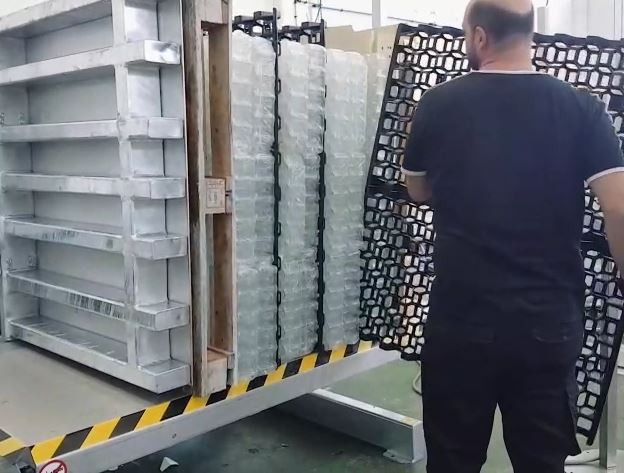 Les palettes plastiques propres venant de la production, sont stockées dans la zone de réception à