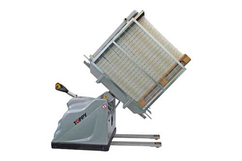 Le retourneur de palette ou inverseur de palette mobiles est un chariot électrique extrêmement polyvalent et compact qui effectue l’opération de changement de palette grâce au basculement sûr de la charge.