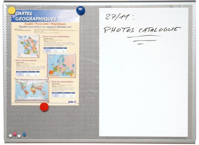 - Acier perforé pour punaisage et affichage magnétique + Acier laqué pour feutre effaçable à sec et affichage magnétique
