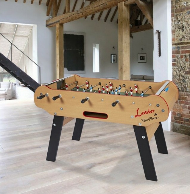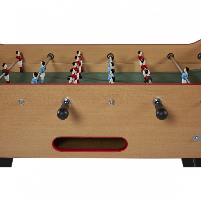 table baby-foot est en bois MDF avec des panneaux couleur hêtre et ses pieds sont en bois massif (hêtre également) peints de couleur noir.Cette structure lui confère une grande stabilité avec poids de 73 kg parfaitement réparti.